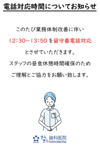 このたび業務体制改善に伴い12:30~13:50を留守番電話対応とさせていただくことになりました。
